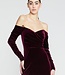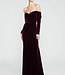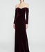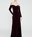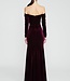 Slip into luxury with this stretch velvet gown, featuring a sweetheart neckline and off-the-shoulder long sleeves. Designed in sumptuous burgundy fabric, this gown includes a built-in stretch bustier for a flawless fit. Read more..