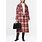 Long coat with an elegant, flowing check pattern in burgundy red and beige, accented with subtle pin..