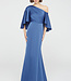 A double-faced satin fit-and-flare gown with an asymmetric neckline and draped cape sleeve, combinin..