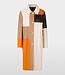 A nappa leather coat by Marc Cain featuring color blocks in off-white, orange, camel, and mocha brow..