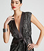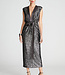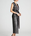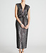 Sleeveless dress in linear sequins with blouson drape and charmeuse obi belt.