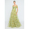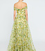 This off-shoulder gown in printed pebble organza glows in soft lilypad greens and golden blooms, wit..