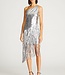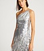 One shoulder sleeveless allover sequin dress with sequin fringe overlay.
