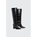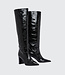 The knee-grazing boots are styled in distressed patent leather and finished with a blocky high heel...