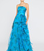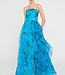 Robe bustier en organza imprimé avec un corsage drapé et une jupe trapèze, rehaussée de volants en cascade et d'un motif floral ludique. Lire plus..
