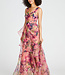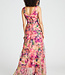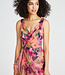 Robe sans manches à col en V en organza avec jupe enveloppante en fausse ligne et volant de jupe.