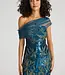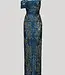 Robe ajustée et évasée entièrement embellie avec une épaule transparente enveloppée de pétale