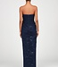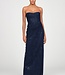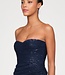 Robe longue sans bretelles en pervenche profonde, avec tulle drapé superposé sur une dentelle à sequins transparents. Son éclat subtil et sa silhouette colonne en font un choix lumineux pour galas et soirées formelles. Lire plus..