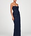 Robe longue sans bretelles en pervenche profonde, avec tulle drapé superposé sur une dentelle à s..
